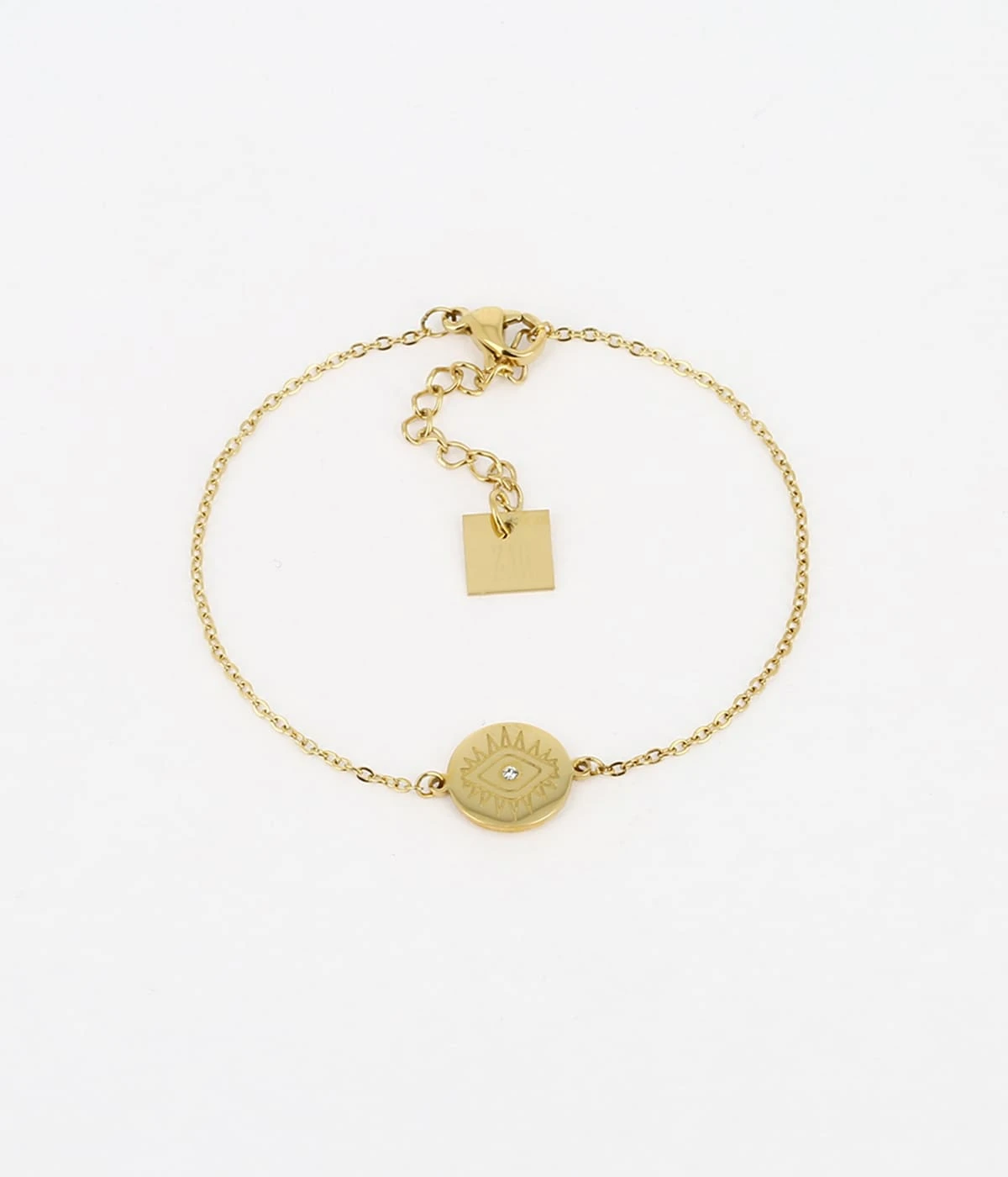Bracelet chaînette en acier uni ou doré à l’or fin sur lequel est attachée une médaille gravée d’un œil protecteur rappelant les motifs de la mythologie égyptienne.