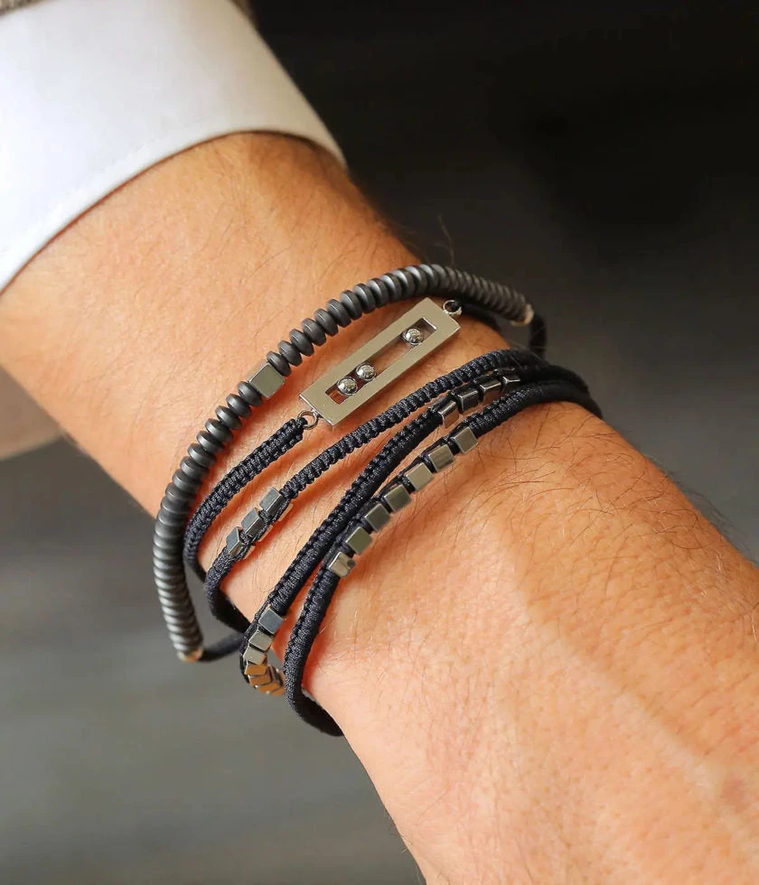 Bracelet cordon noir ajustable qui s’enroule trois fois sur le bras, sur lequel sont enfilées des perles carrées de métal gris.