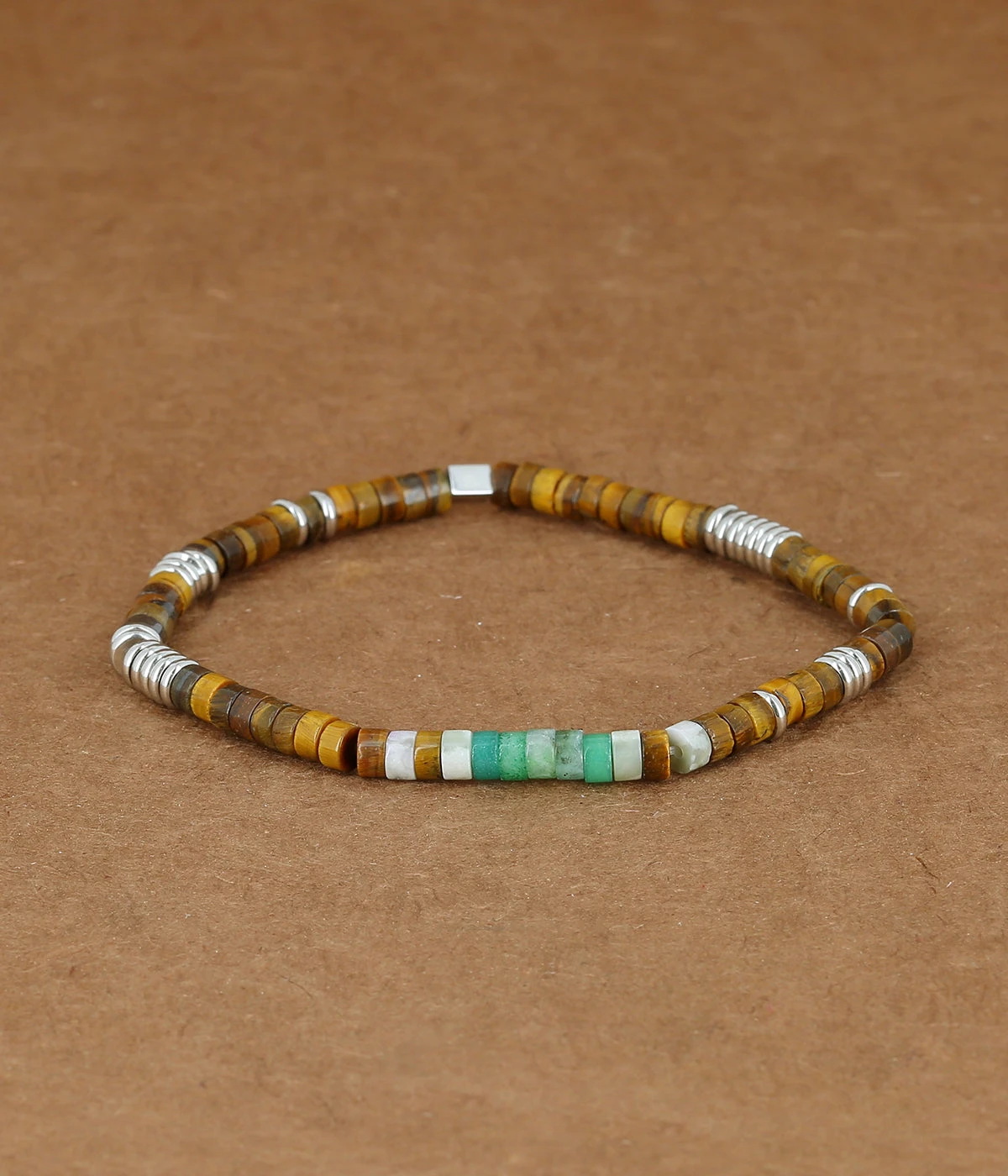 Bracelet élastique sur lequel des rondelles colorées sont enfilées.