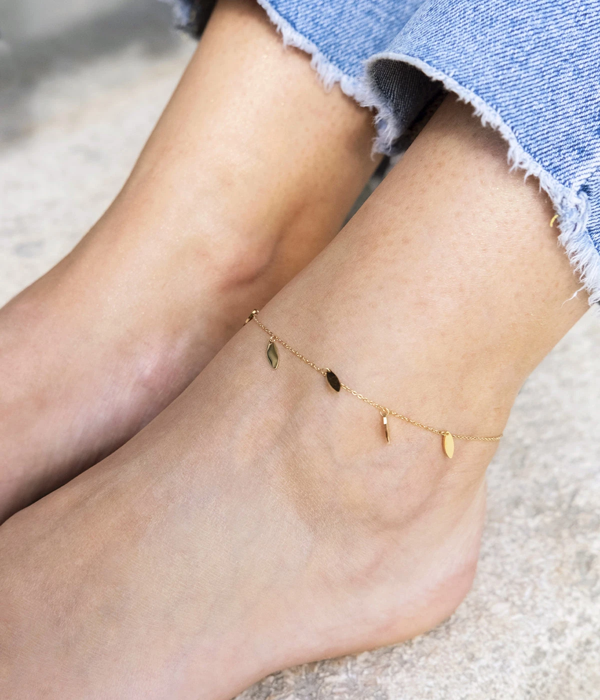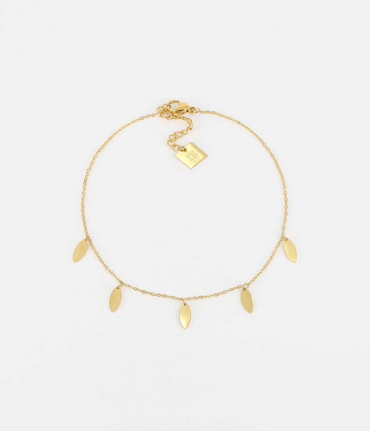 Similaire à notre incontournable chaîne de cheville « Confettis », cette nouvelle pièce en acier uni ou doré à l’or fin est composée de petites pampilles plates en métal imitant une feuille de thé.