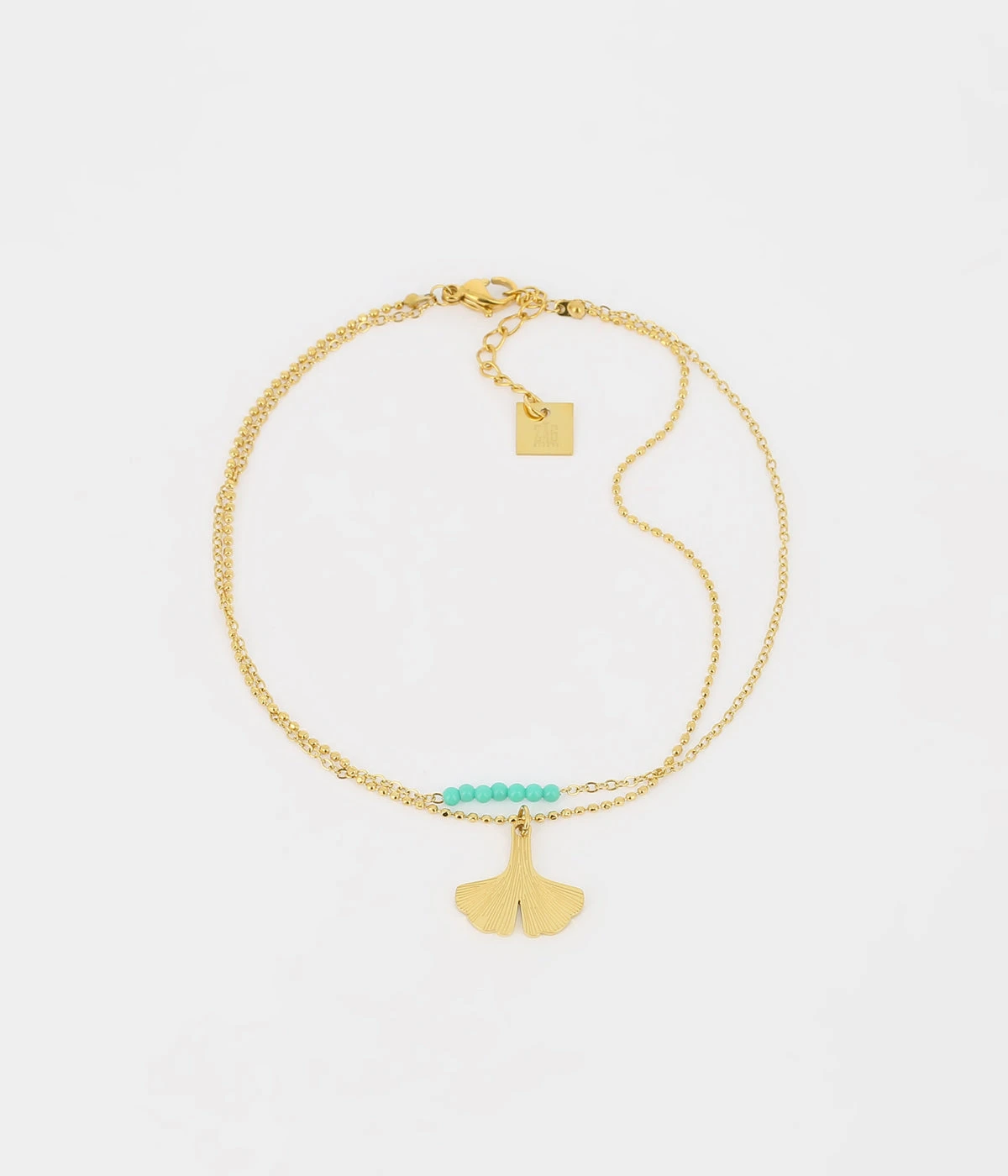 Double chaîne de cheville en acier uni ou doré à l’or fin sur laquelle sont alignées des pierres turquoises et une pampille en forme feuille de gingko.