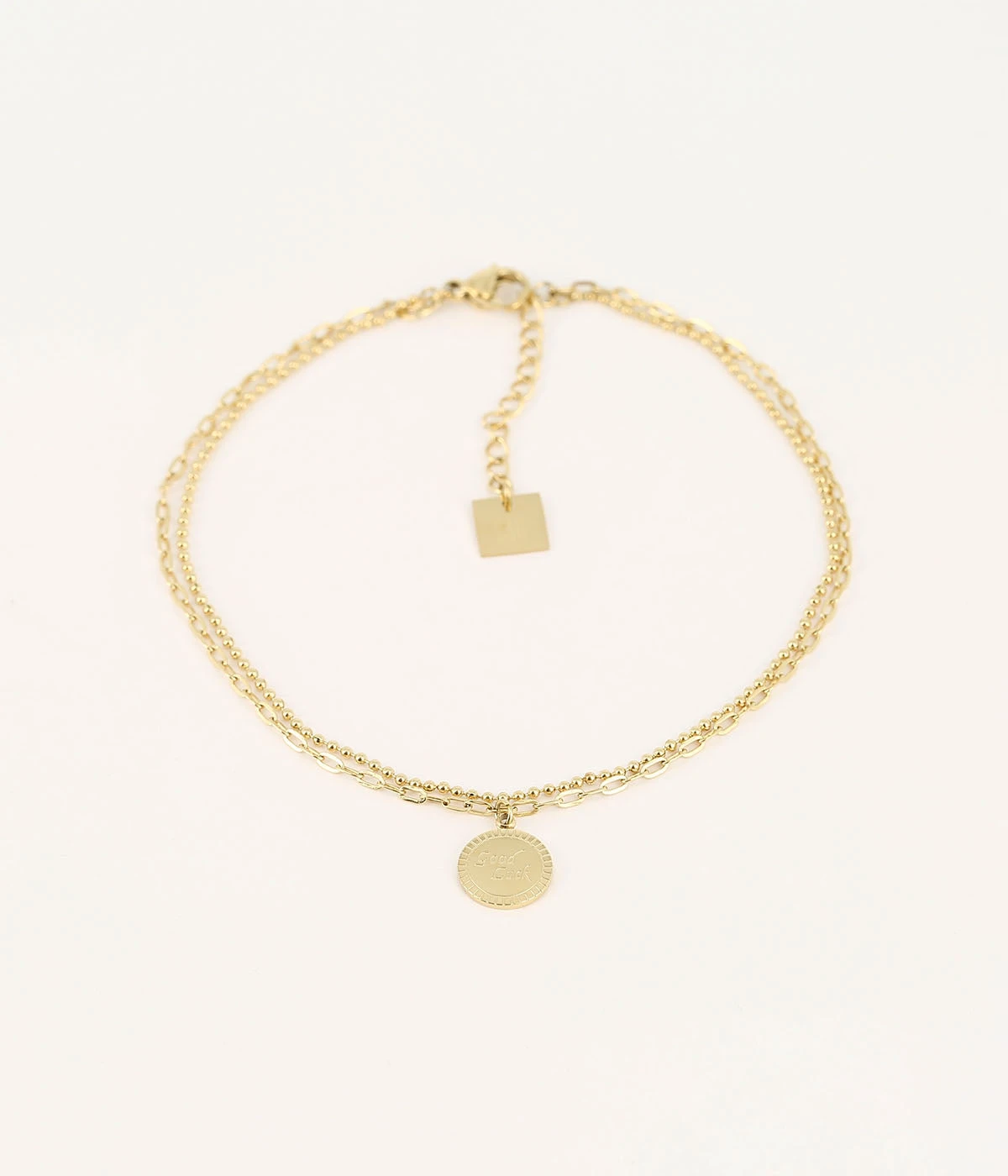 Double chaîne de cheville en acier uni ou doré à l’or fin sur laquelle est attachée une médaille « Good Luck ».