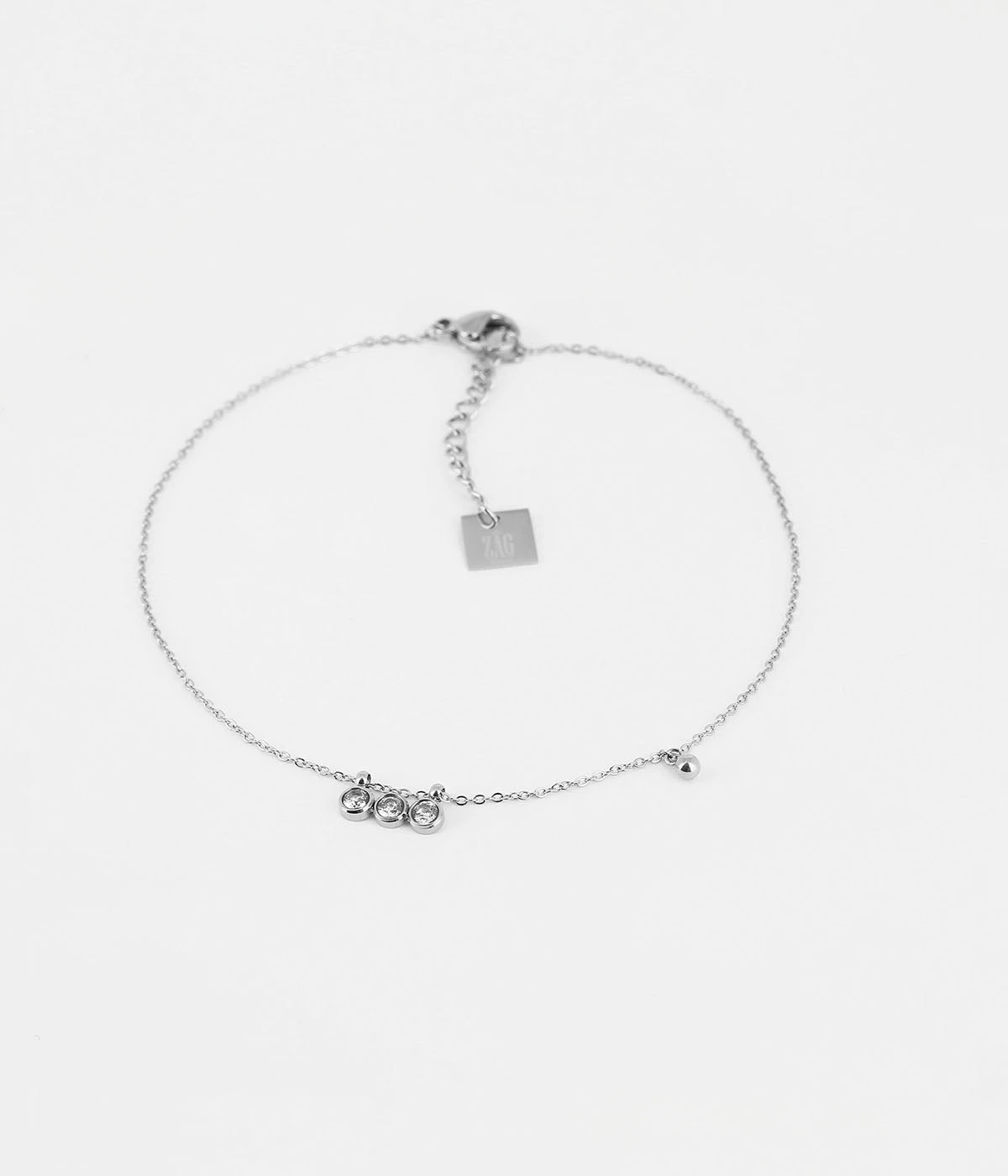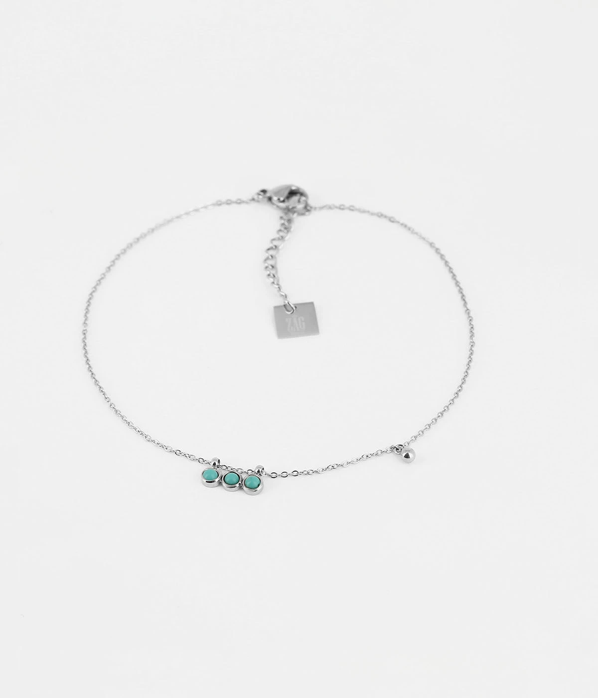 Chaîne de cheville en acier uni dont le pendentif est composé soit de 3 zirconiums soit de 3 turquoises.