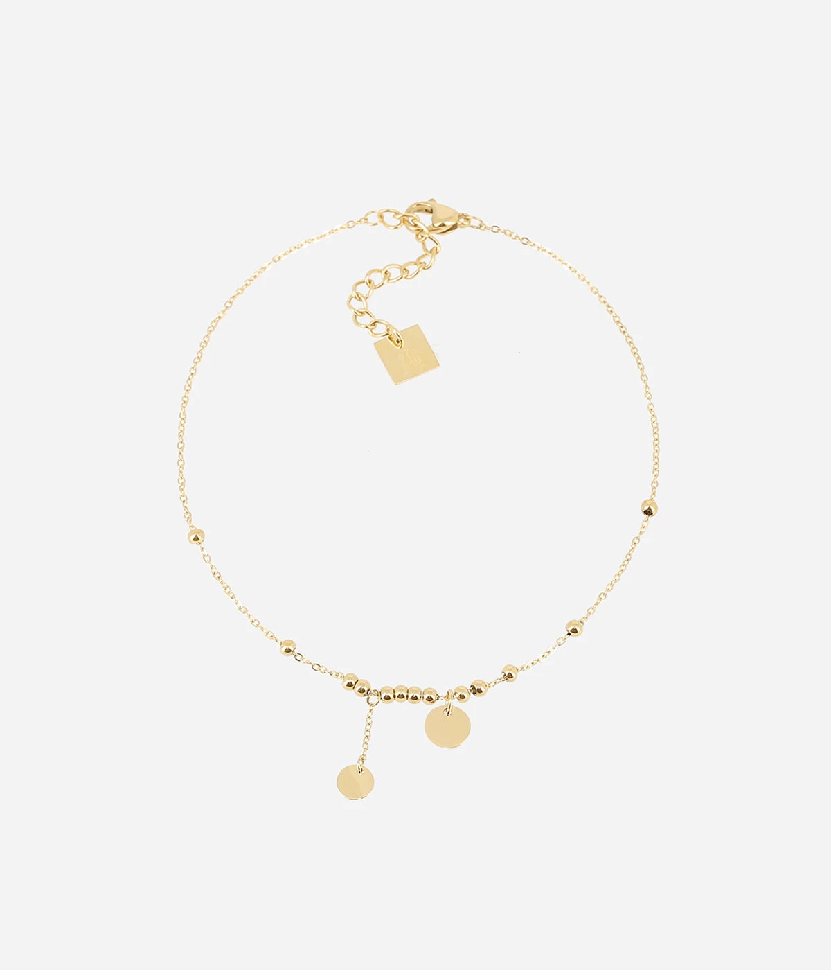 Chaîne de cheville en acier uni ou doré à l’or fin sur laquelle sont enfilées des petites boules en acier et est suspendu des petits motifs de formes géométriques.