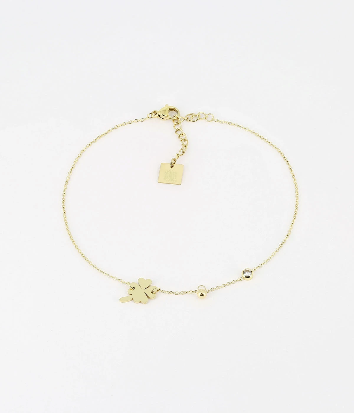 Chaîne de cheville en acier uni ou doré à l’or fin sur laquelle sont attachés un délicat motif de trèfle à quatre feuilles et un zirconium serti clos.