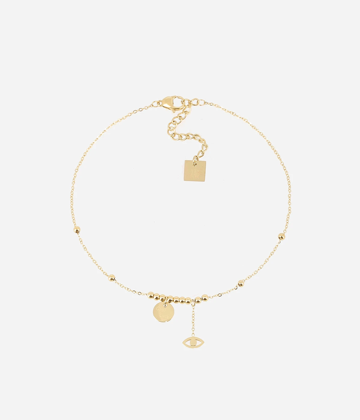 Chaîne de cheville en acier doré à l’or fin sur laquelle sont enfilées des petites boules en acier, des petits motifs en forme d’œil, ainsi qu’une plaque gravée du message « Good Luck ».