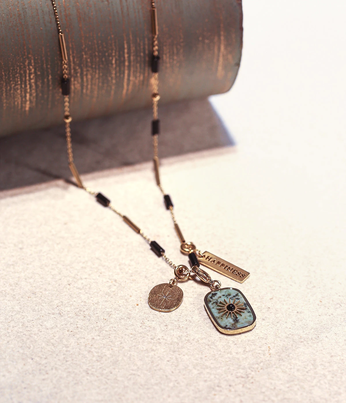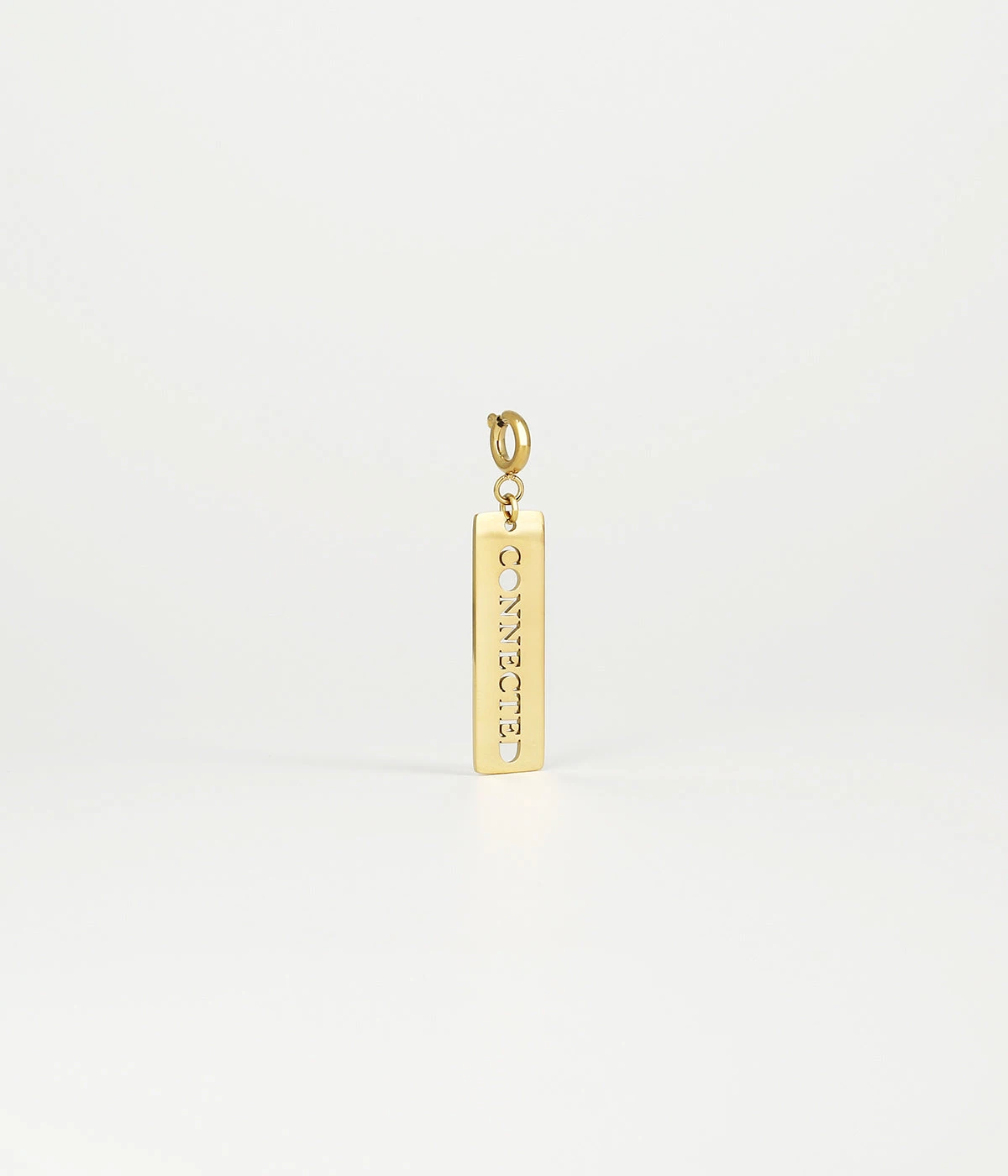 Ce charm en acier doré à l’or fin, se compose d’un mousqueton sur lequel est accrochée une plaque avec le mot « Connected » ajouré.