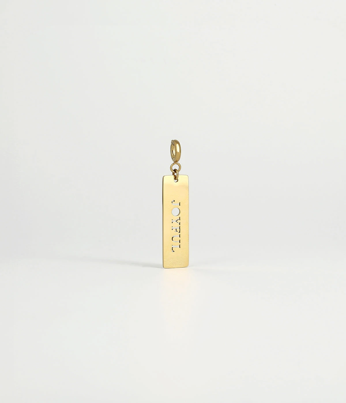Ce charm en acier doré à l’or fin, se compose d’un mousqueton sur lequel est accrochée une plaque avec le mot « Joyful » ajouré.