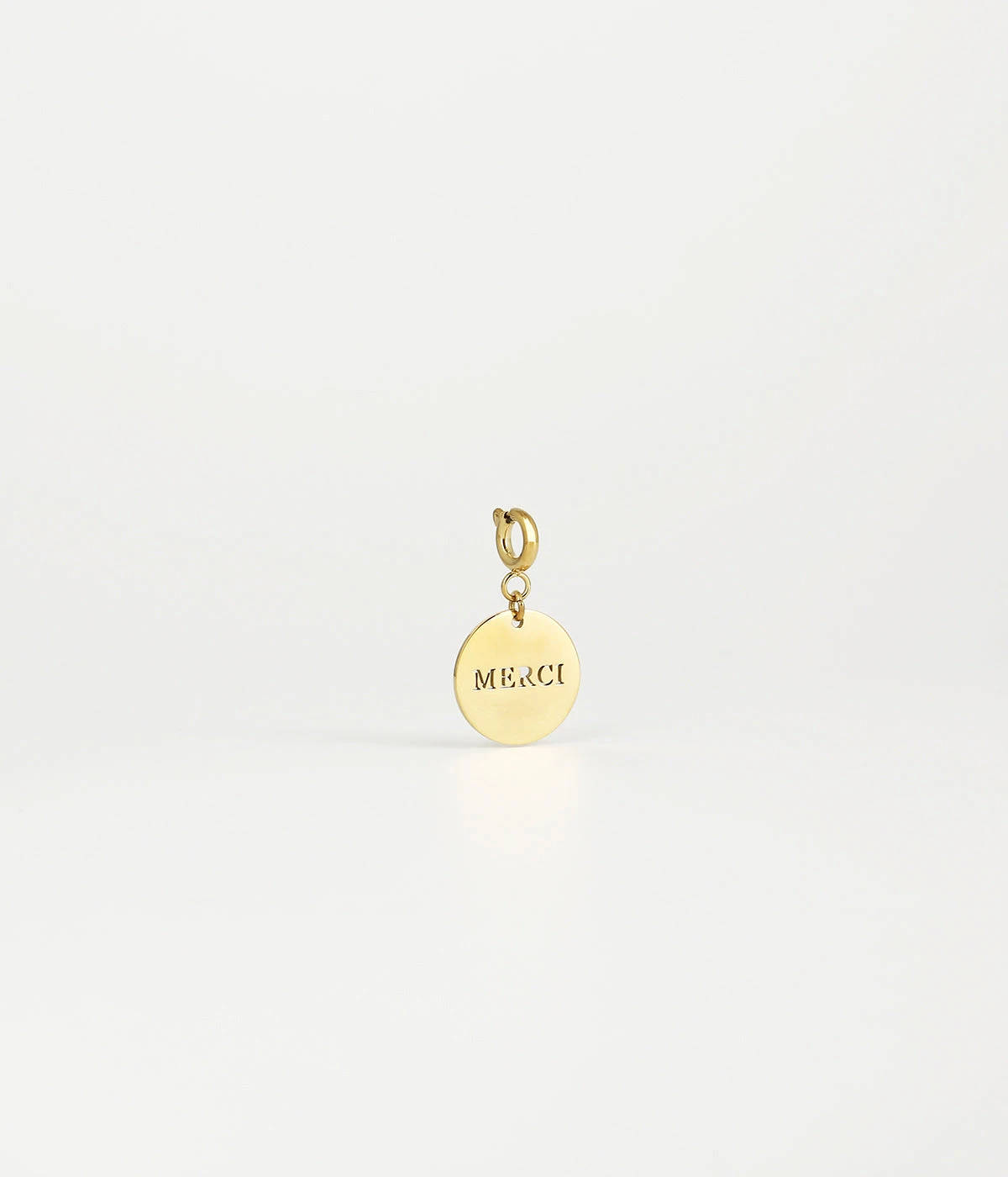 Ce charm en acier doré à l’or fin, se compose d’un mousqueton sur lequel est accrochée une médaille avec le message « Merci » ajouré.