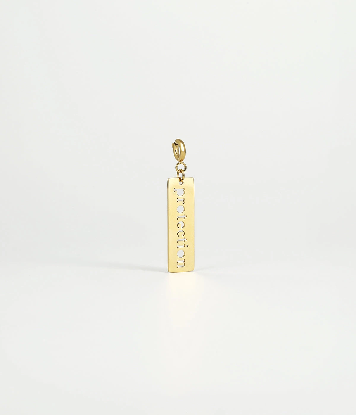 Ce charm en acier doré à l’or fin, se compose d’un mousqueton sur lequel est accrochée une plaque avec le mot « Protection » ajouré.