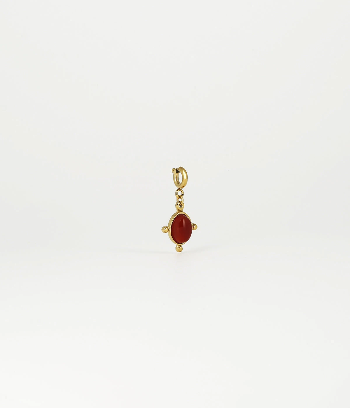 Ce charm en acier doré à l’or fin, se compose d’un mousqueton sur lequel est attaché un cabochon de pierre fine, orné de boules dorées.