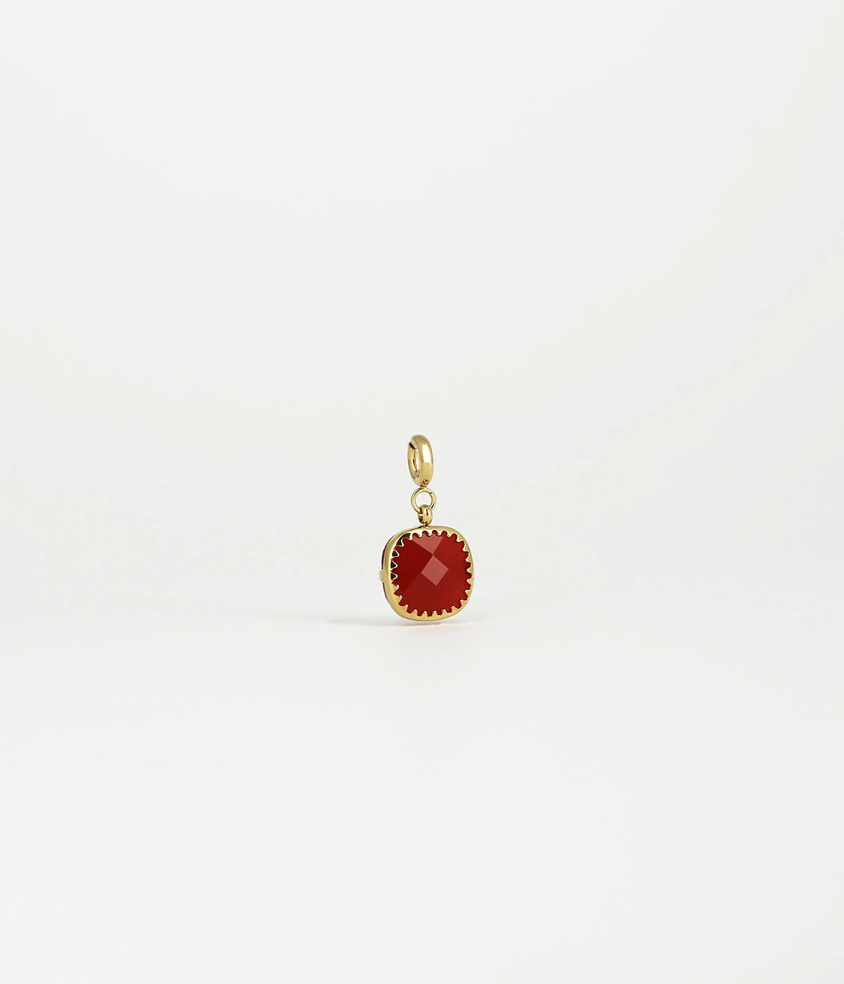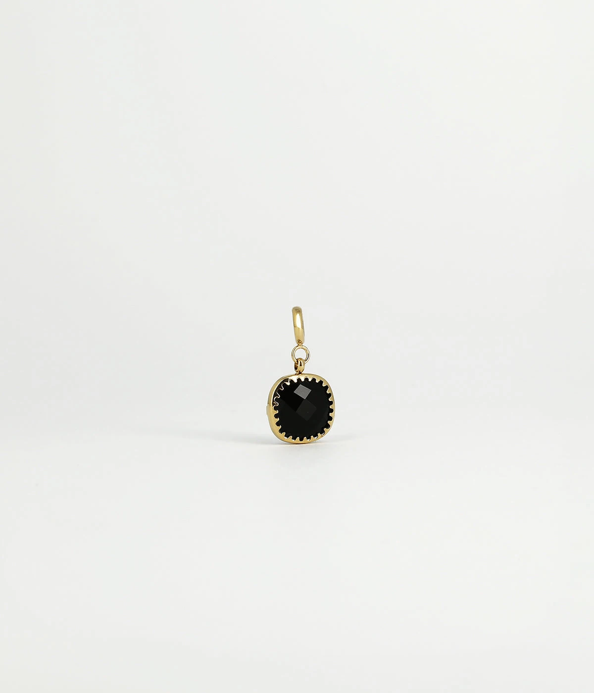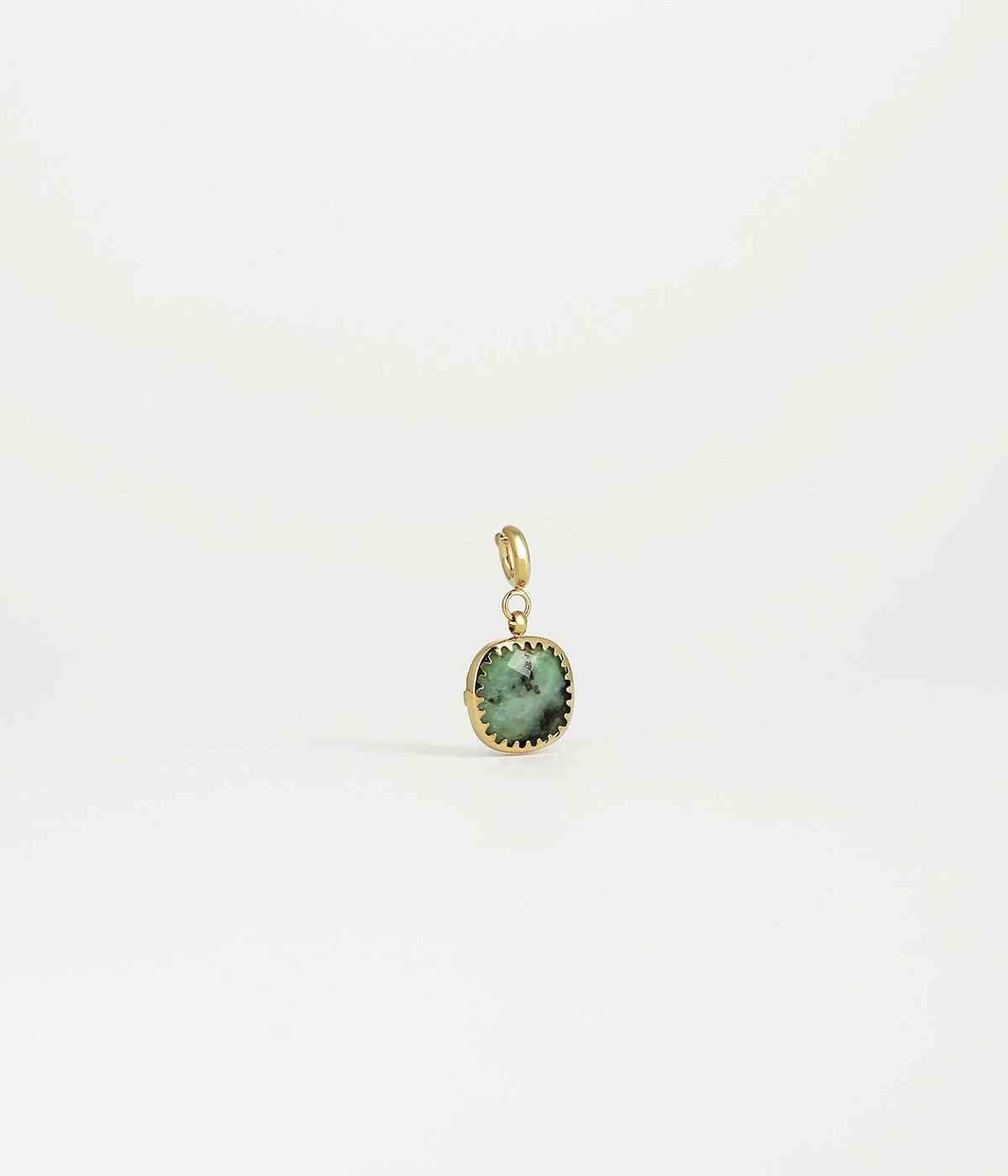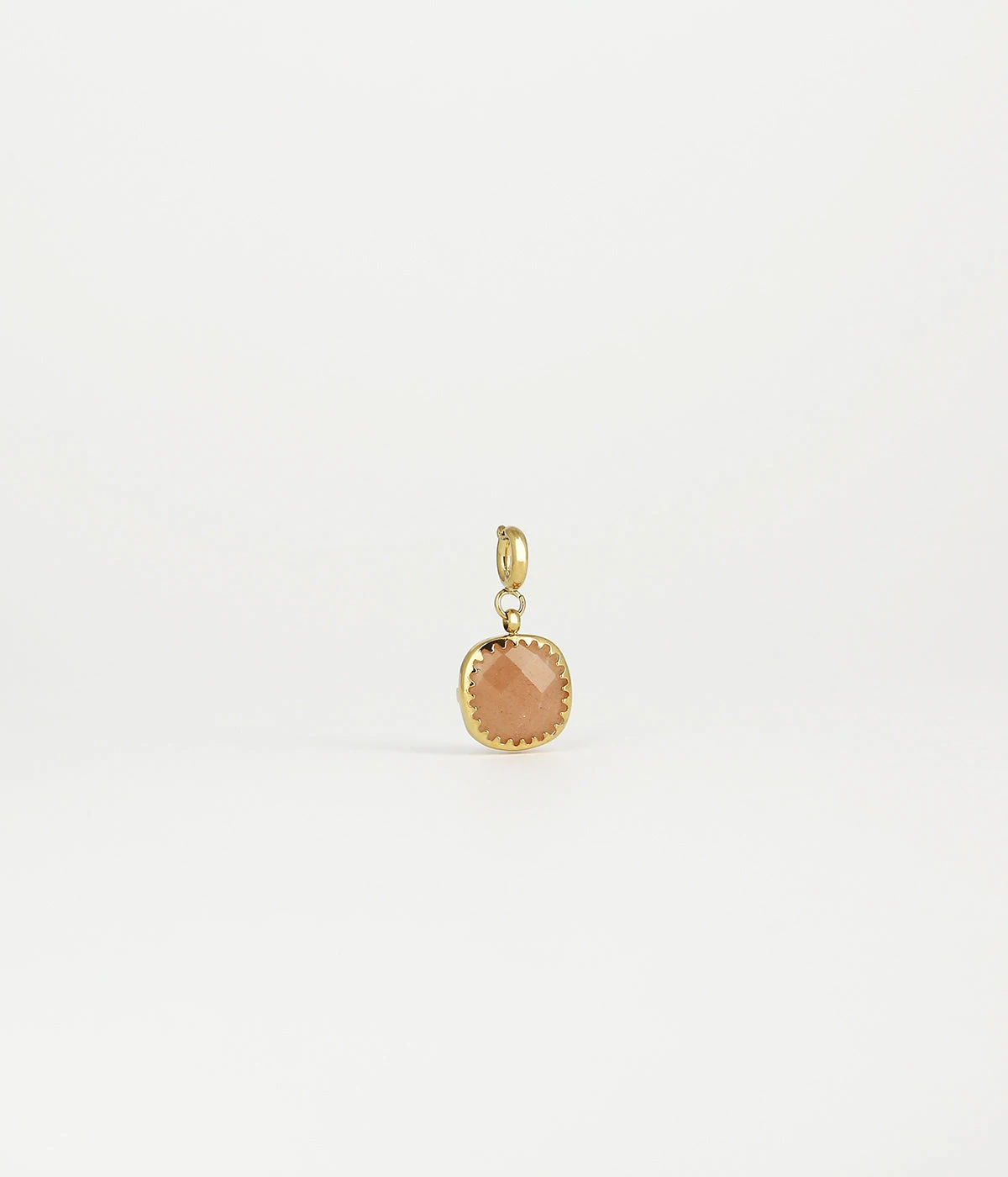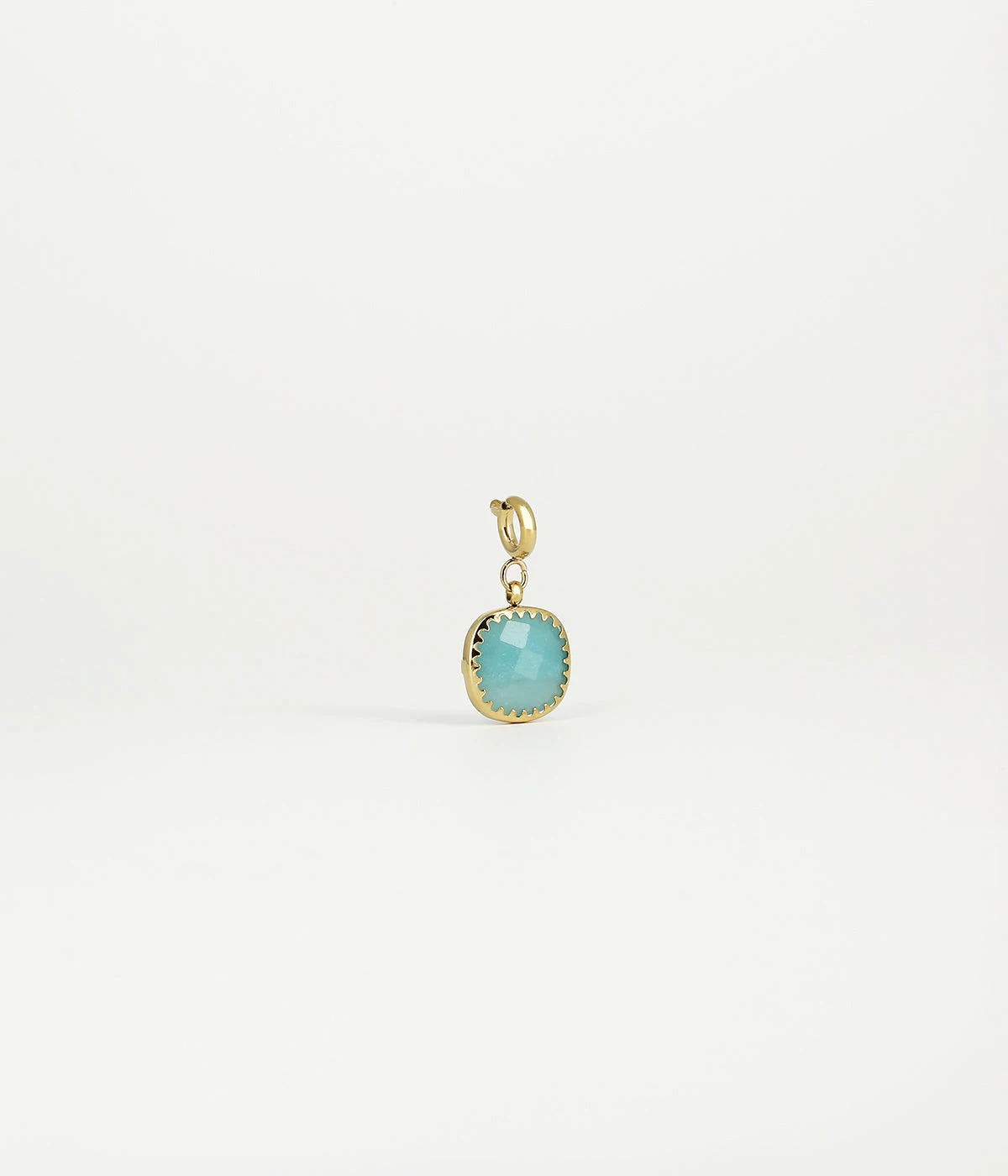 Ce charm en acier doré à l’or fin, se compose d’un mousqueton sur lequel est accrochée une pierre naturelle entourée d’une fine couche dorée dentelée.