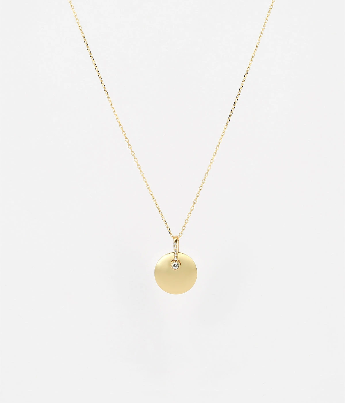 Collier en acier uni ou doré à l’or fin sur lequel se trouve un médaillon uni est attaché par des zirconiums.