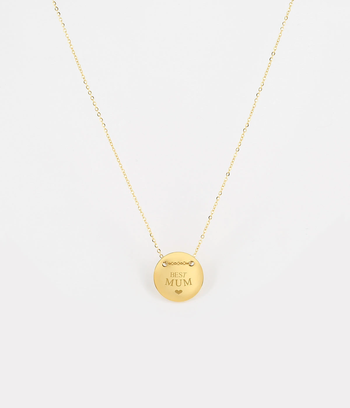 Collier en acier uni ou doré à l’or fin sur lequel une médaille gravée du mot « Best Mum » est attachée.