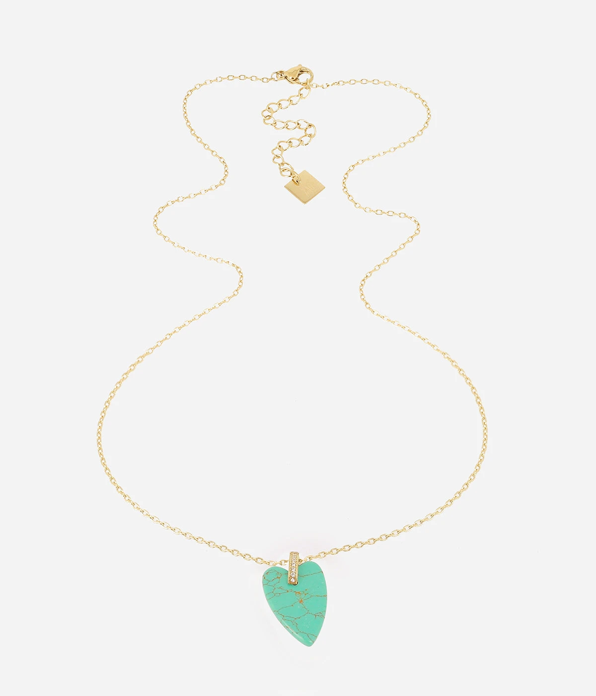 Collier en acier doré à l’or fin sur lequel est attaché un motif coloré en forme de coeur.