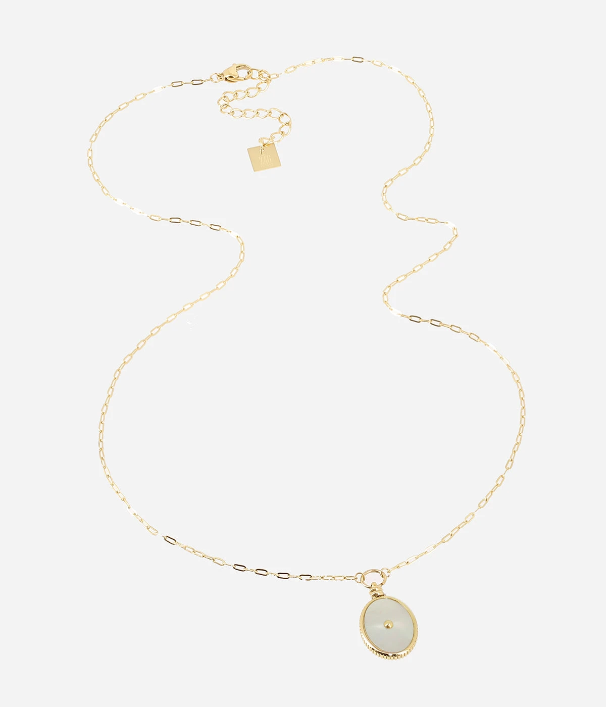 Collier en acier doré à l’or fin sur lequel est attaché un pendentif ovale en pierre naturelle.