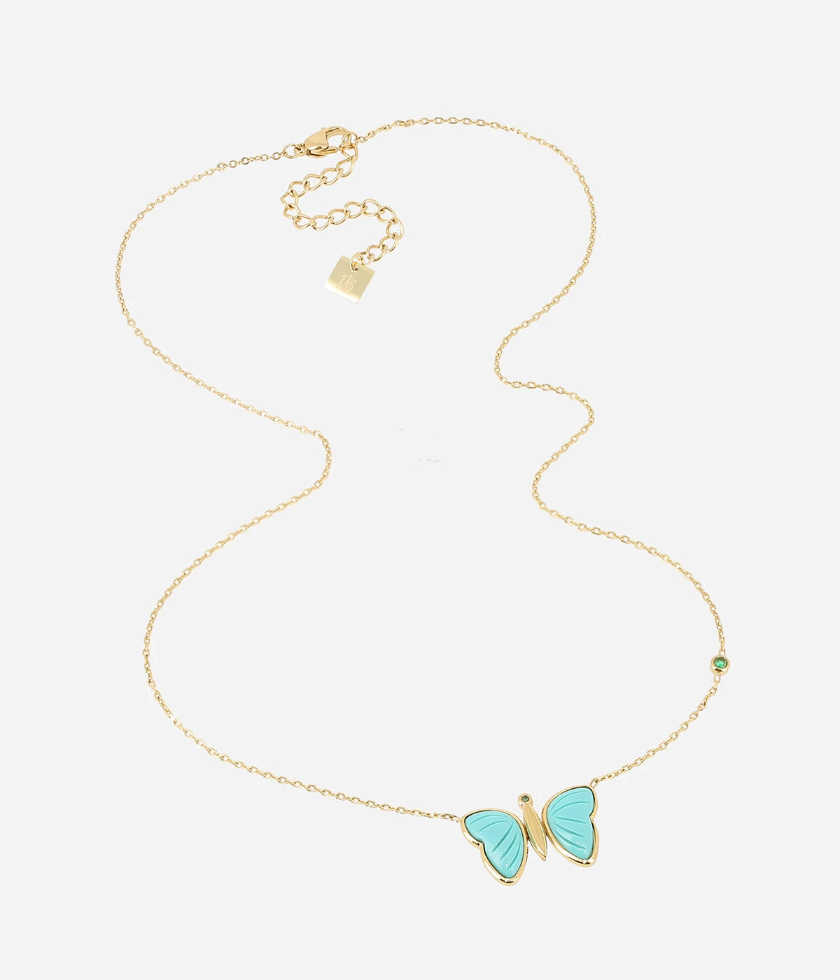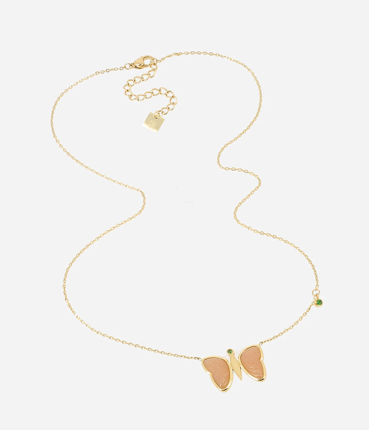 Collier en acier doré à l’or fin sur lequel un motif papillon en pierre naturelle est attaché. Un petit zirconium coloré sur trouve sur la chaîne.