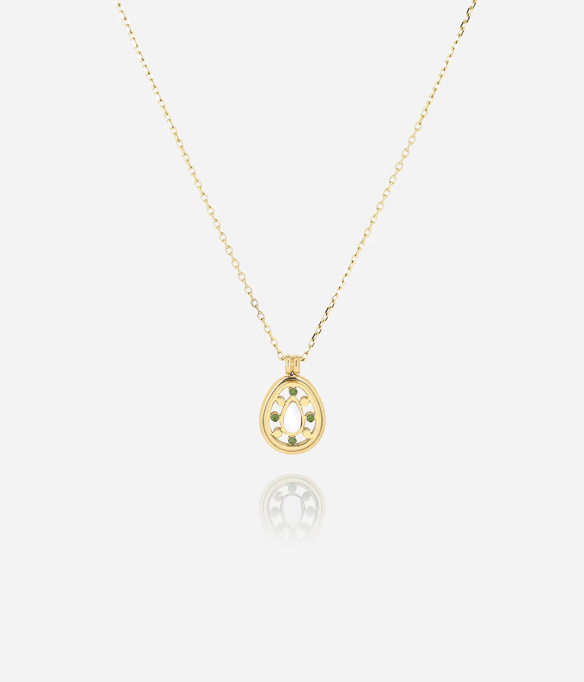 Collier en acier doré à l’or fin où se trouve un pendentif composé d’une pierre et de zirconiums colorés.