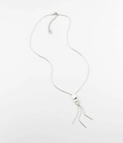 Collier en acier uni ou doré à l’or fin orné de trois médailles de métal sur lesquelles s’accrochent des chaînettes terminées de fines tiges de métal.