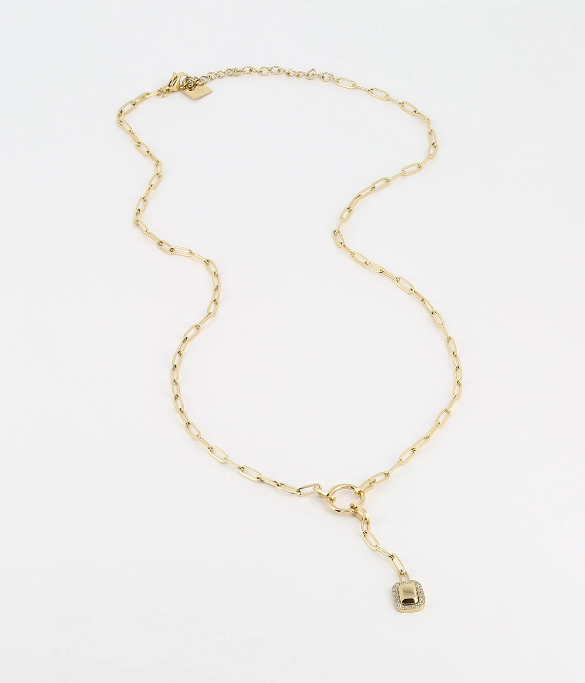 Collier long à maillons en acier doré à l’or fin sur lequel est suspendu un pendentif rectangulaire serti des zirconiums.
