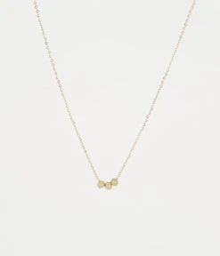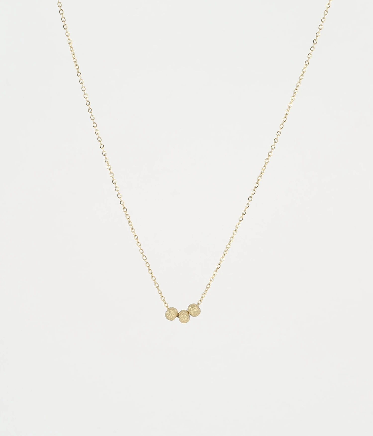 Collier chaînette en acier doré à l’or fin sur lequel est enfilé trois petites boules dorées irisées.