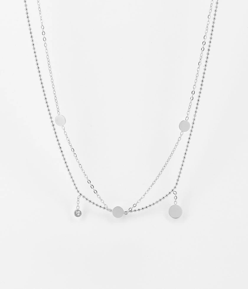 Collier double rang en acier uni sur lequel sont suspendues des petites pampilles et des zirconiums.