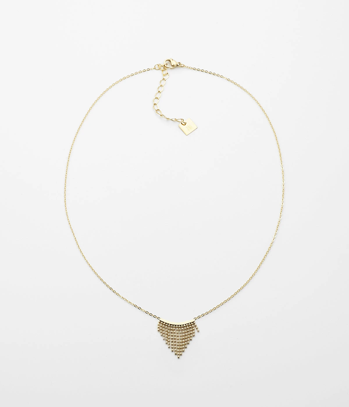 Collier chaîne en acier doré à l’or fin sur lequel est attaché un dégradé de petites boules faisant l’effet d’un pagne tribal.
