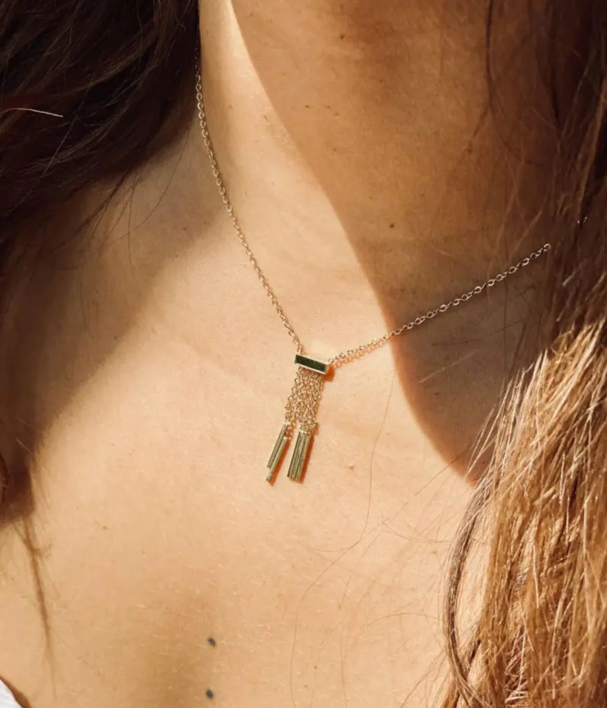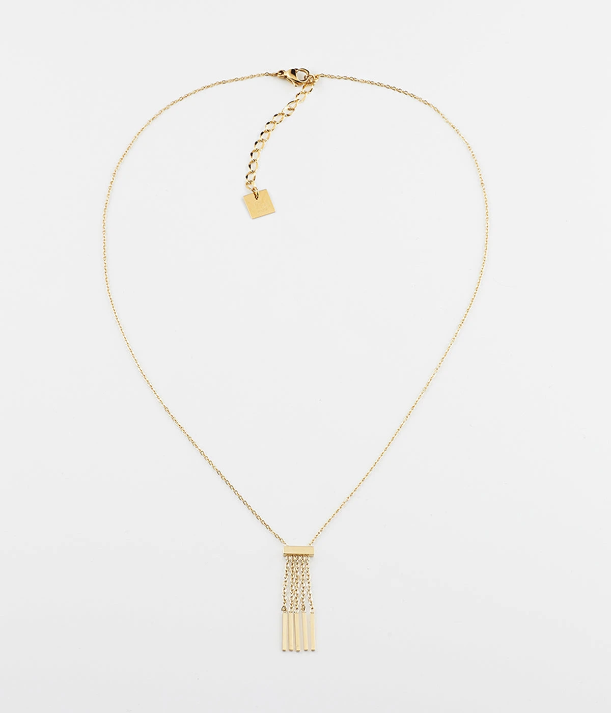 Petite pluie de chaînettes terminées de pampilles de métal pour ce collier en acier uni ou doré à l’or fin.