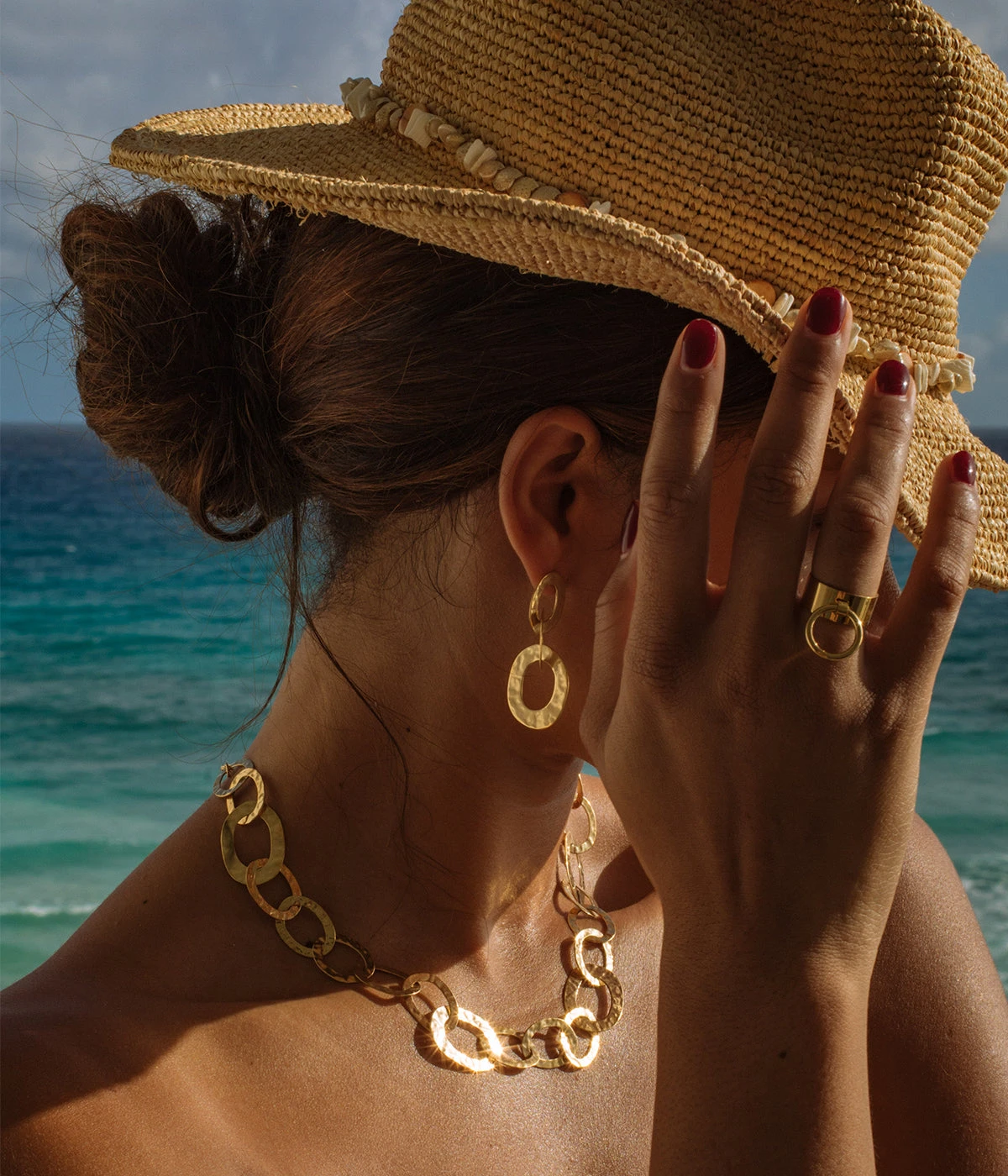 Collier en acier doré à l’or fin, formé de gros anneaux plats martelés à la main dans nos ateliers.