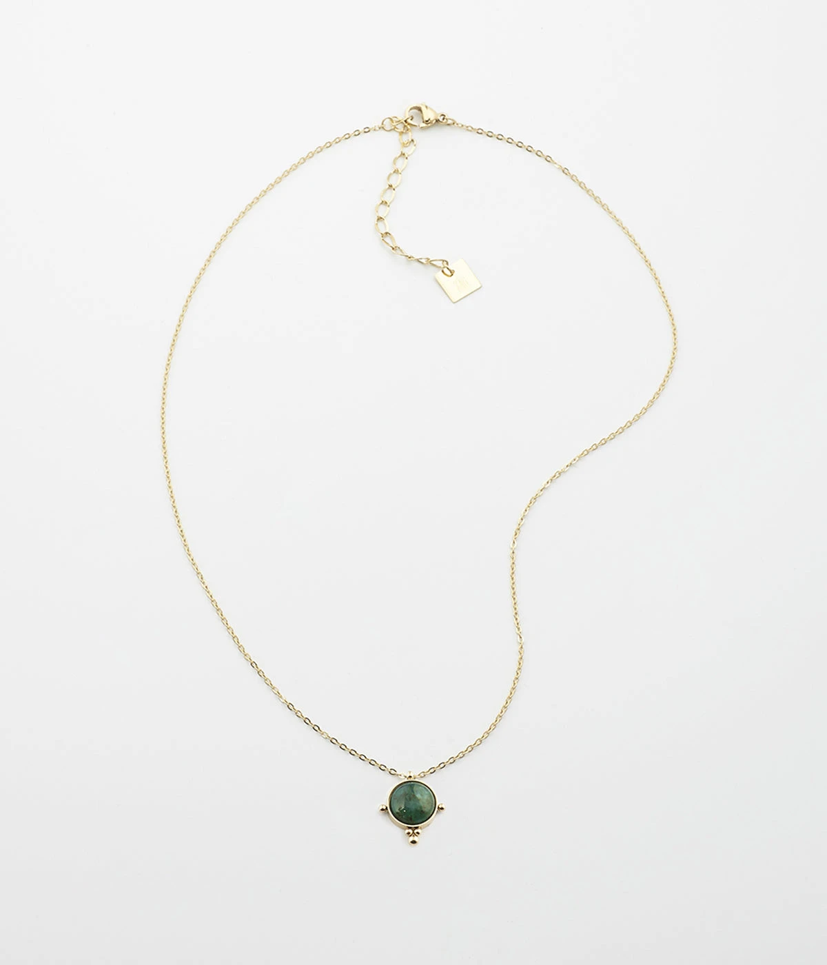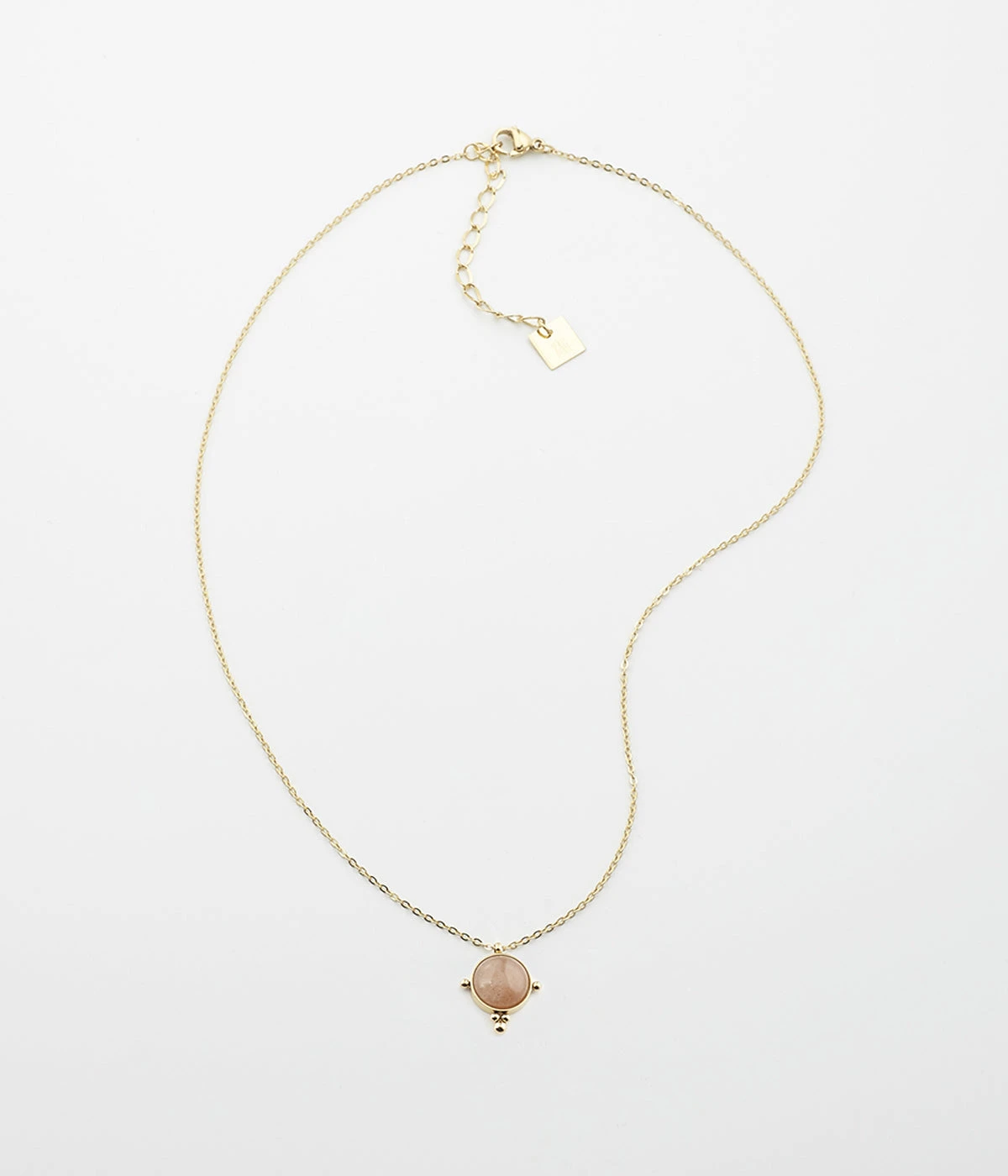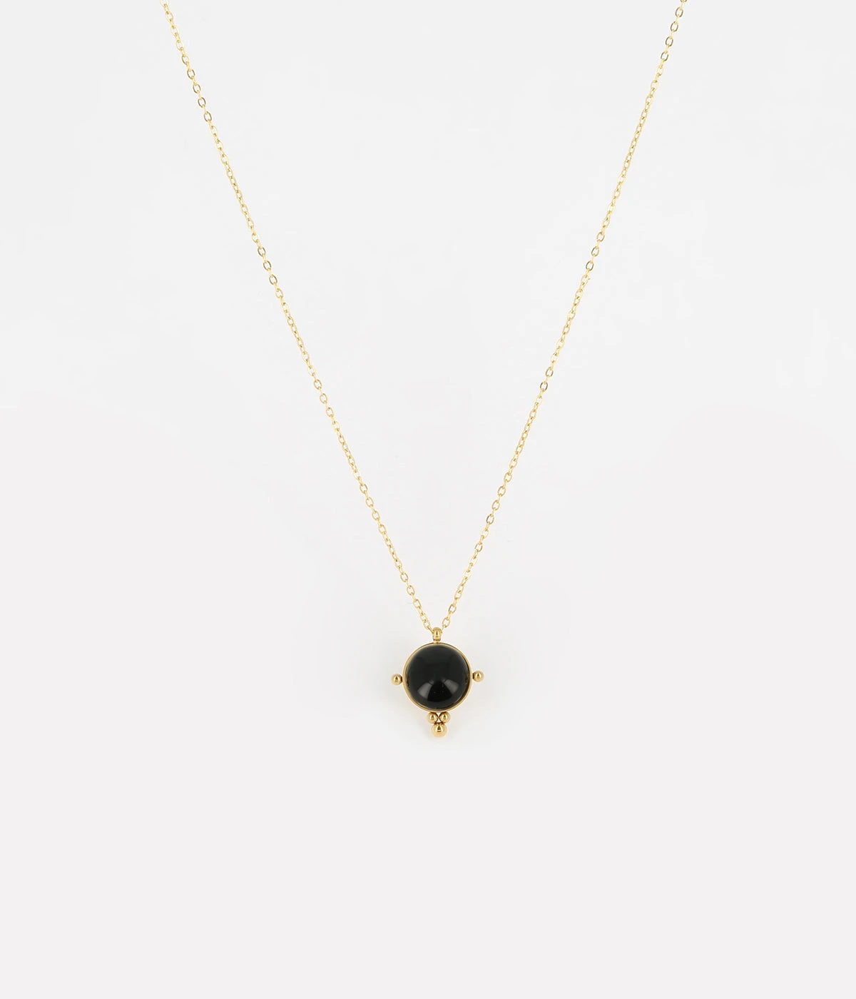 Collier chaîne en acier doré à l’or fin sur lequel un pendentif de pierre naturelle est accroché.