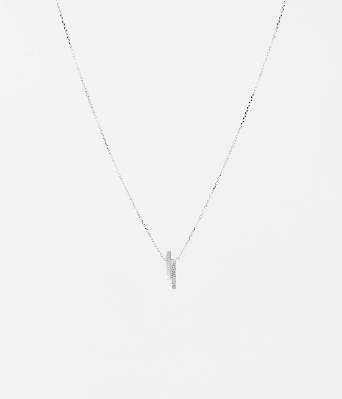 Collier en acier uni ou doré à l’or fin sur lequel deux barrettes, dont l’une sertie de zirconiums, sont attachées.