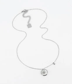 Collier chaîne en acier uni ou doré à l’or fin sur laquelle est attachée, en pendentif, une médaille de couleur piquée d’un soleil d’or.