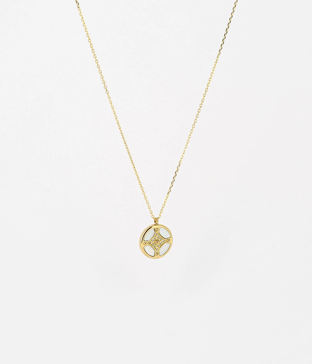 Collier en acier uni ou doré à l’or fin. Collier mettant en valeur un pendentif en forme géométrique nacré. Le centre de cette médaille est composé de plusieurs zirconiums.