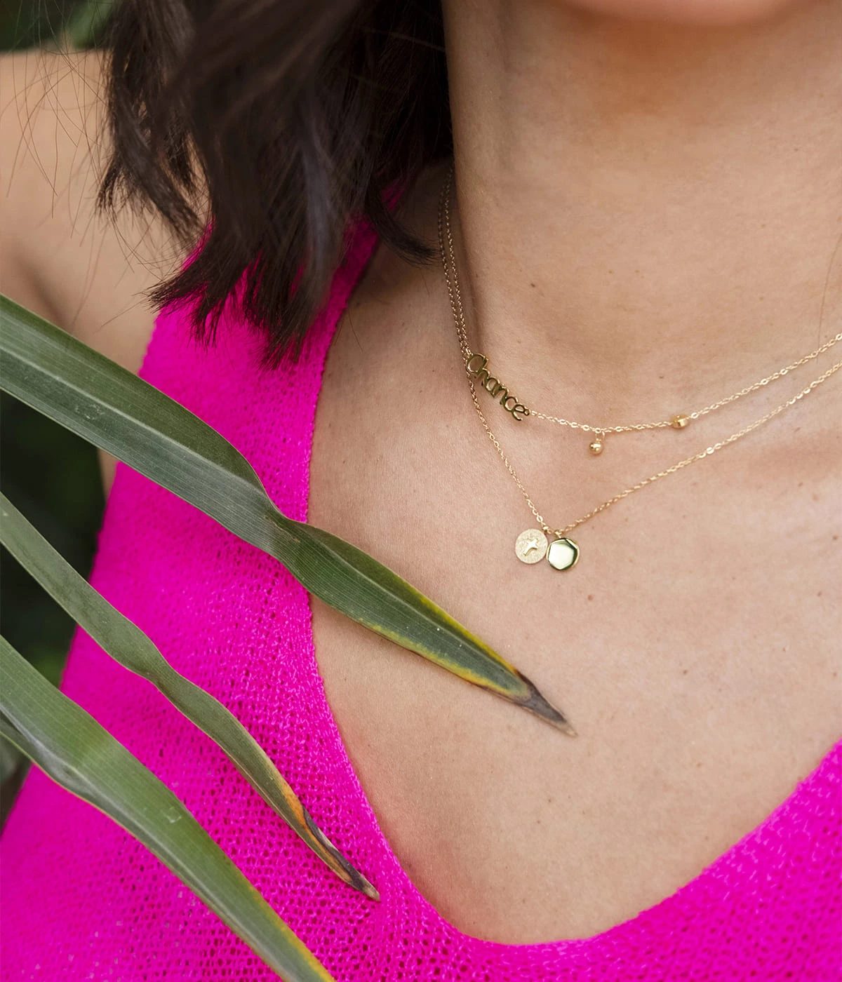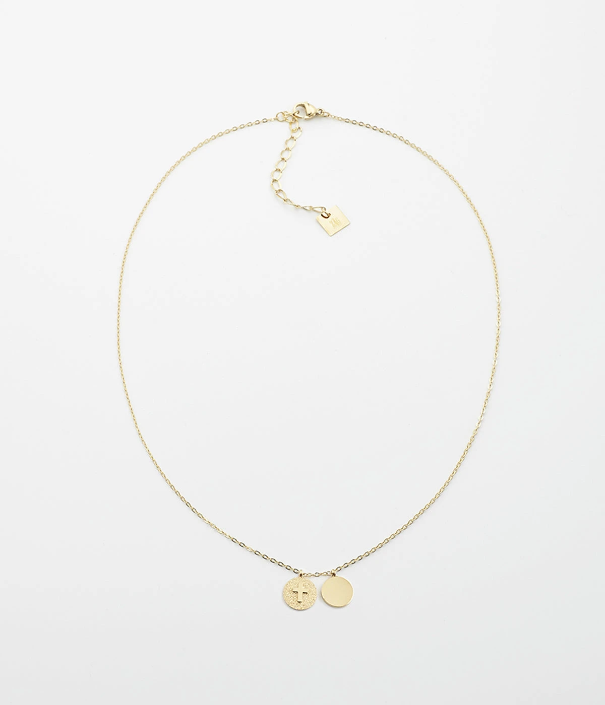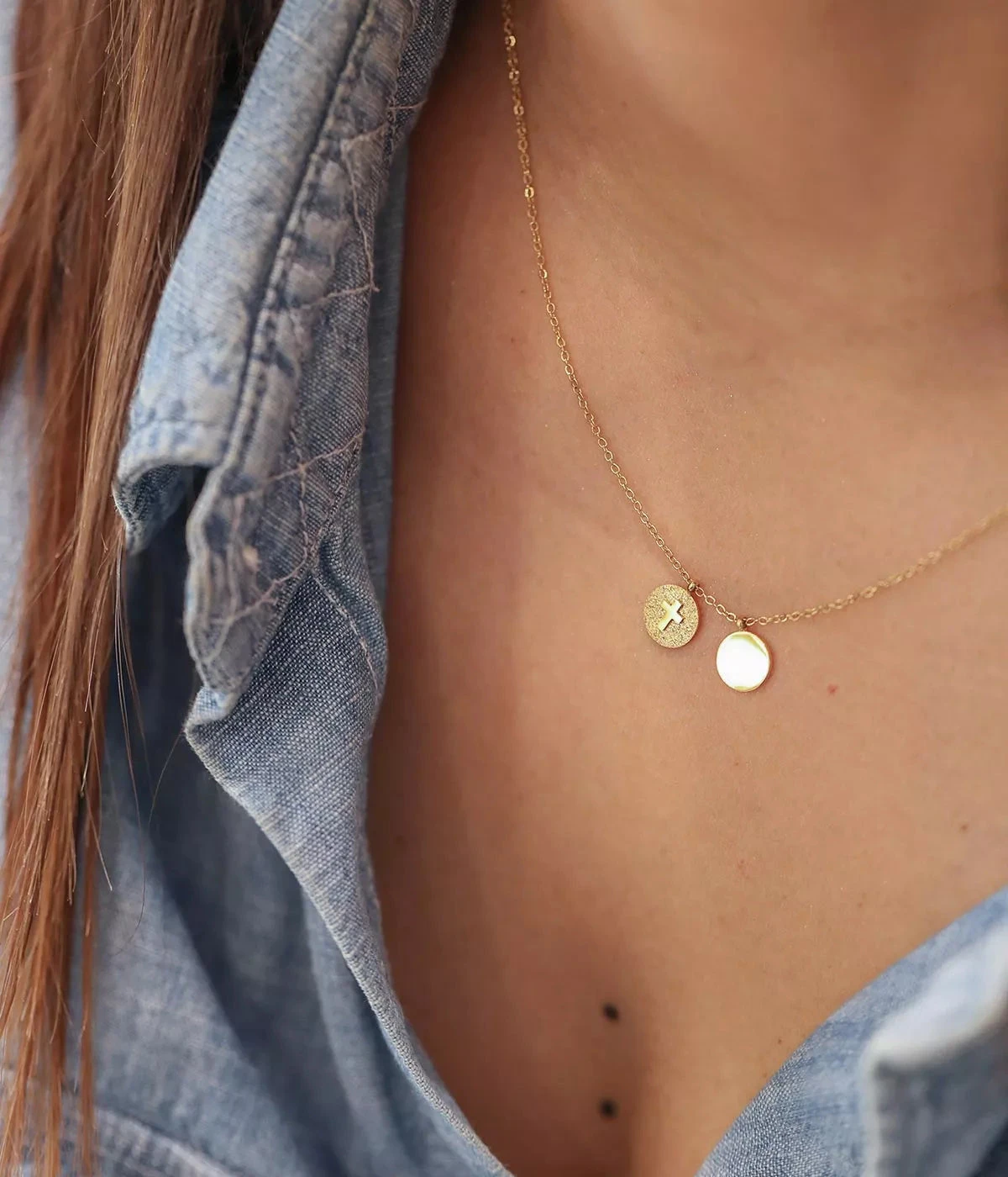 Collier chaîne en acier doré à l’or fin sur lequel sont attachées deux petites médailles, l’une avec un motif croix sur fond martelé, et l’autre, lisse et pure.