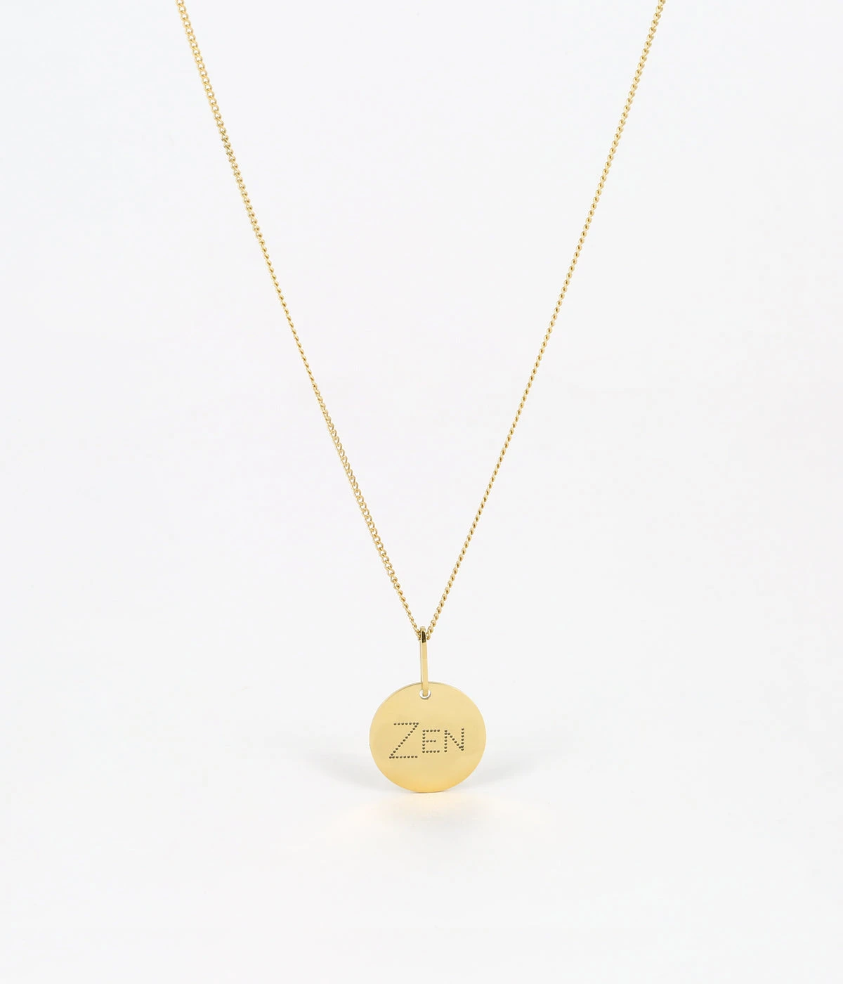 Collier chaîne en acier uni ou doré à l’or fin sur lequel une médaille gravée du mot « Zen » est attachée. La gravure est réalisée à la main dans nos ateliers et sa réalisation au petit point est pleine de délicatesse.
