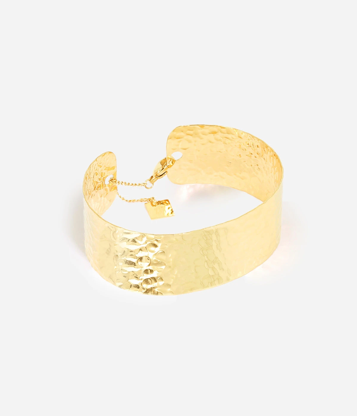 Jonc martelé en acier doré à l’or fin avec une chaînette fermoir qui relie les extrémités.