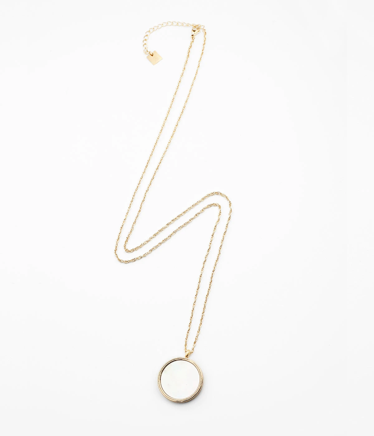 Collier long « à l’ancienne » en acier uni ou doré à l’or fin sur laquelle est accrochée une médaille de nacre.